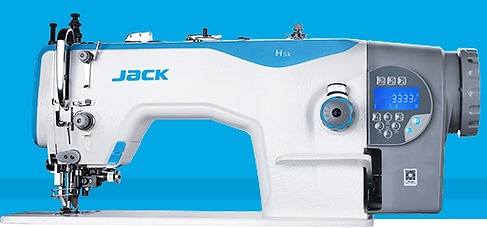 Máquina Reta Industrial Eletrônica de Transporte Duplo Marca Jack Modelo Novo H5, com caixa de controle e painel acoplados ao cabeçote da máquina que simplifica a montagem para alta produção com cores e designer moderno